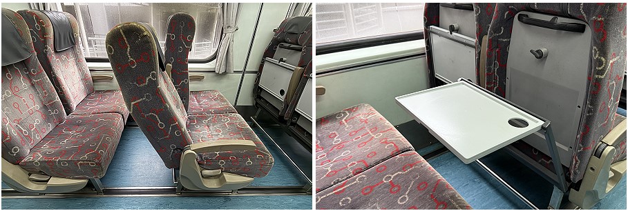 The train only has standard class seating, but all seats are comfortable, with good padding and a reasonable reclining angle. There are curtains to block out the sun if needed. A pull-down table is attached to the back of the seat in front. Legroom was ample for me, until the person in front reclined their seat all the way back. Luckily, the train had plenty of empty seats, so I was able to move elsewhere.