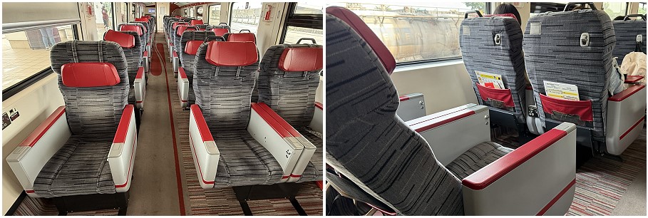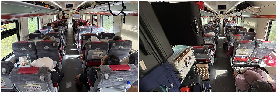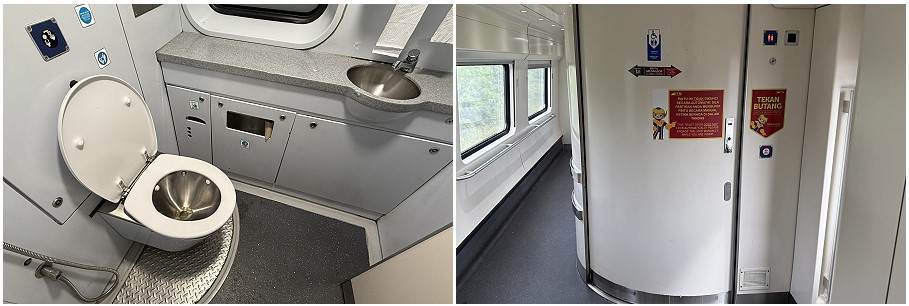 In Standard Class, seats are arranged in a 2 + 2 configuration. They are slightly narrower with a little less legroom but still comfortable enough. Half of the carriage faces backwards, but you can choose your preferred direction when booking online. The seats in the middle share a table. Unlike the Gemas-KL train I took the day before, the table here has no legs blocking movement, making it much better. Also, the seats at each end face the middle of the train, whereas on the Gemas train, seats faced towards the end of the carriage. The padding in these seats is also much thicker compared to the Gemas train.
