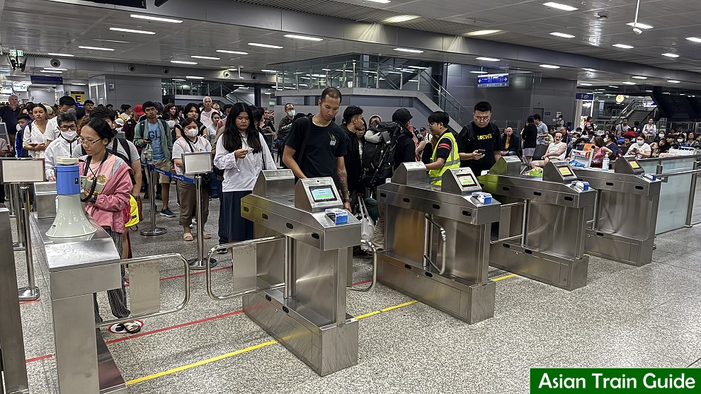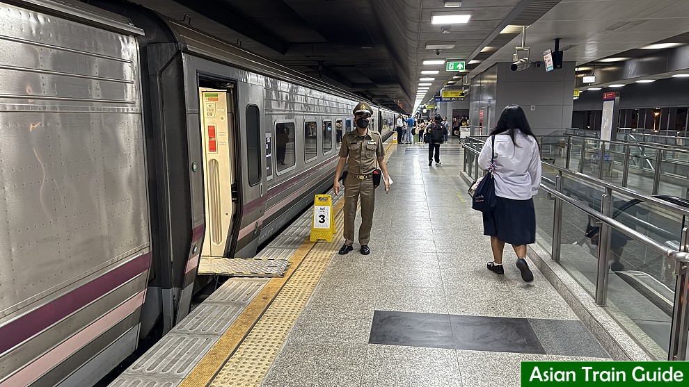 At Krung Thep Aphiwat Station, we were allowed to board the train twenty minutes before departure. To pass through the automatic ticker barriers, we had to scan the QR Code on our tickets. As I had bought mine online, I just scanned the QR Code in the D-Ticket app on my smartphone. From here you go up a lift or escalators to the platform on the second floor. Passengers who were in carriages 2-5 were told to use the right-hand escalator. Passengers in carriages 6-13 were told to use the left-hand escalator.