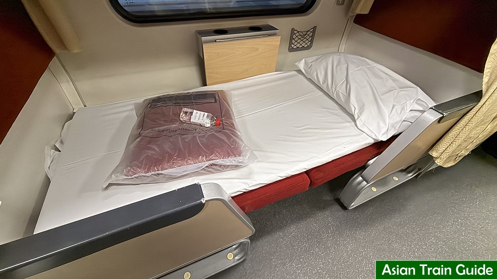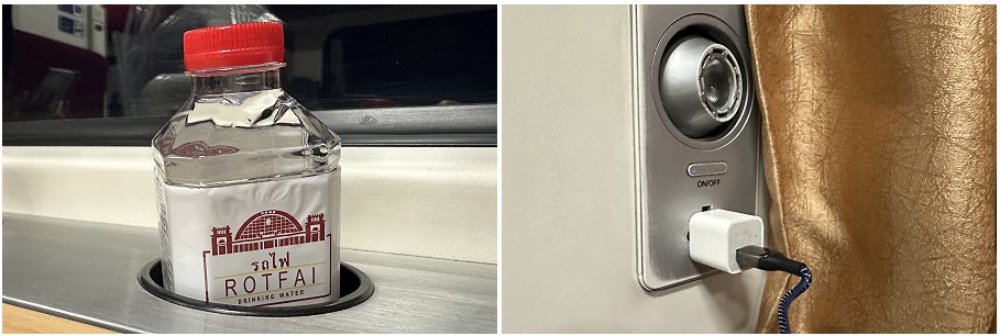 Each berth has a power socket for charging devices and a reading light with two brightness levels. Besides the privacy curtains for the corridor, you also get curtains for the window. A note: if you’re in the upper berth, there’s no window, unlike sleeper trains in some other countries. The day seat’s backrest on the lower berth can be lifted up to provide a bit more space, which is useful for tall people like myself. It also serves as a handy shelf for light items. Overall, there was enough space for me to sleep comfortably on my back or side. I slept soundly through the night and woke up only when we arrived in Udon Thani.