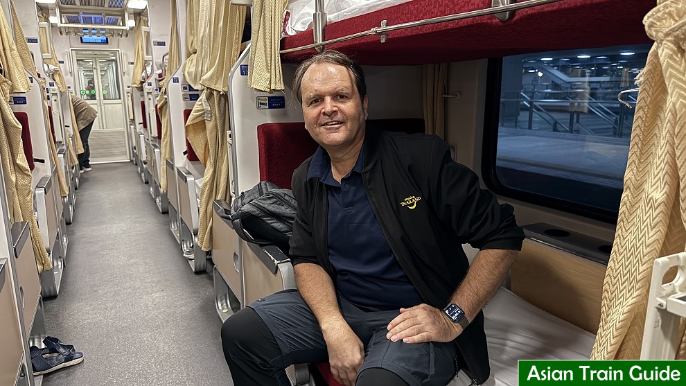 Thailand’s flagship sleeper trains are the Chinese-built CNR models, which were introduced on four routes in 2016. Even though they’re now eight years old, they’re still in excellent condition. You don’t have to choose 1st Class cabins for comfort and cleanliness—the 2nd Class carriages are just as good and even better in some ways. Since it was already late, the carriage attendants had prepared our beds with clean sheets. I booked a lower berth as usual, since it’s slightly wider and further away from the bright lights and cold air-conditioning. The air-conditioning is often set to freezing, so I always bring a jacket. It’s also wise to have an eye mask and earplugs, especially on the CNR trains where the curtains are quite thin and let in a lot of light.
