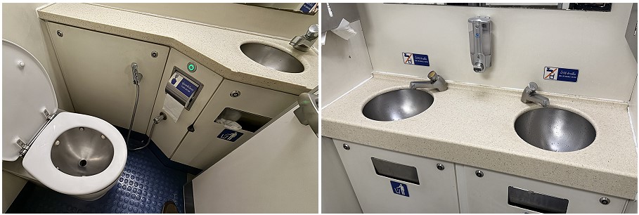 The toilets are airplane-style and maintained well. There are two cubicles with Western-style toilets and one cubicle with a urinal. Each has a washbasin with soap and toilet paper. Outside, you’ll find two more washbasins and a mirror, perfect for brushing your teeth or shaving.
