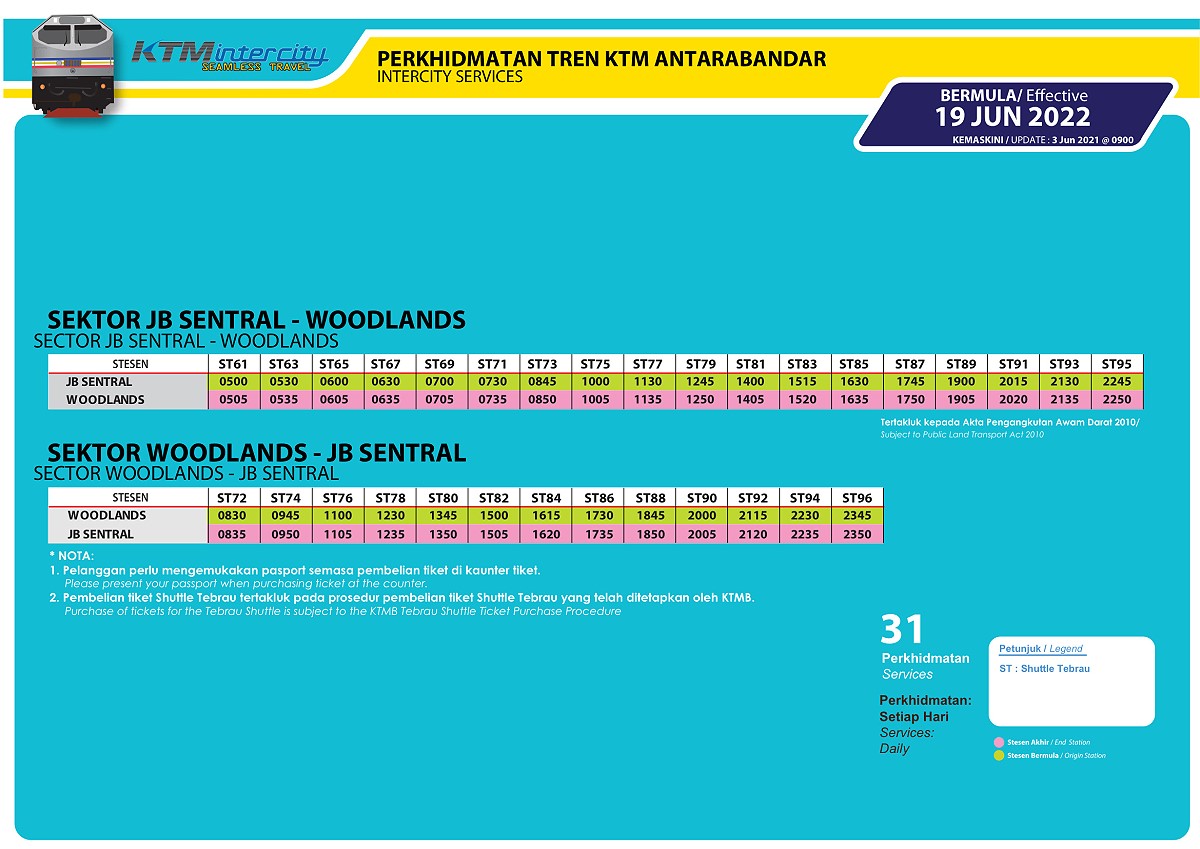 Timetable for Shuttle Tebrau: JB Sentral > Woodlands > JB Sentral Source: https://www.ktmb.com.my/traintime.html RETURN TO: Guide to the Railways of Malaysia Share this: Click to share on Facebook (Opens in new window) Facebook Click to share on X (Opens in new window) X Like this:Like Loading...