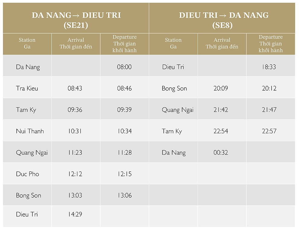 The Vietage departs every morning from Da Nang Railway Station at 8:00 a.m. and heads south to Quy Nhon where it arrives in the afternoon, six hours later. It makes the return journey in the late afternoon, departing from Dieu Tri Railway Station 6:33 p.m. and arriving in Da Nang around midnight.