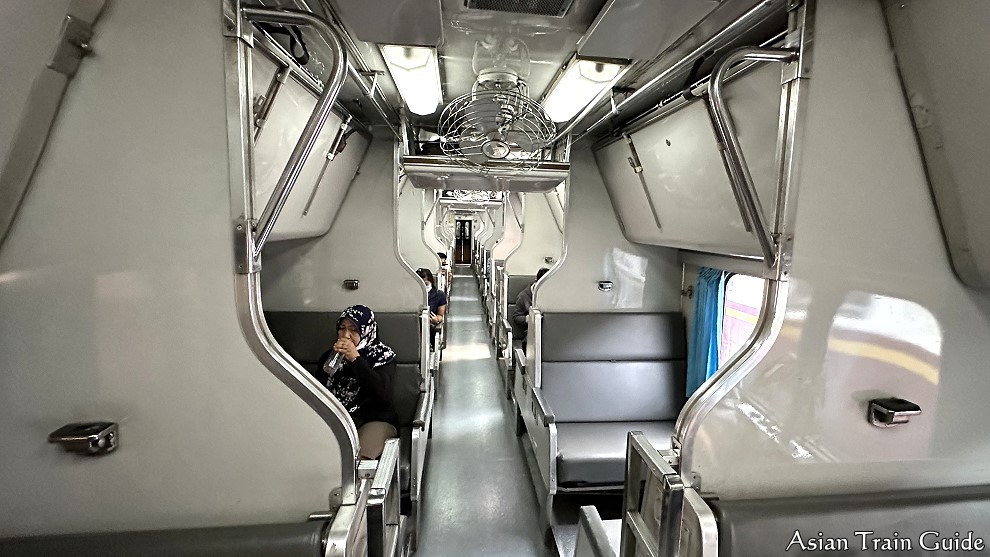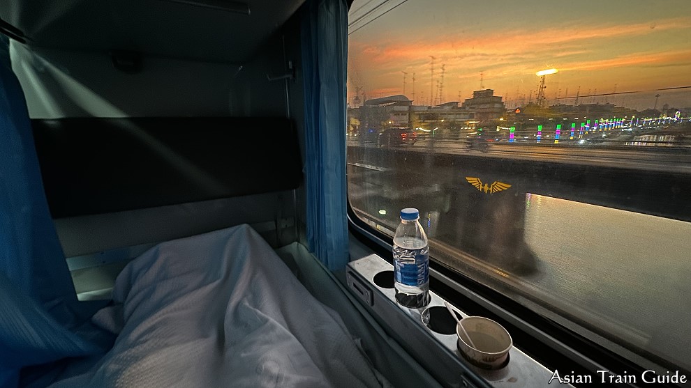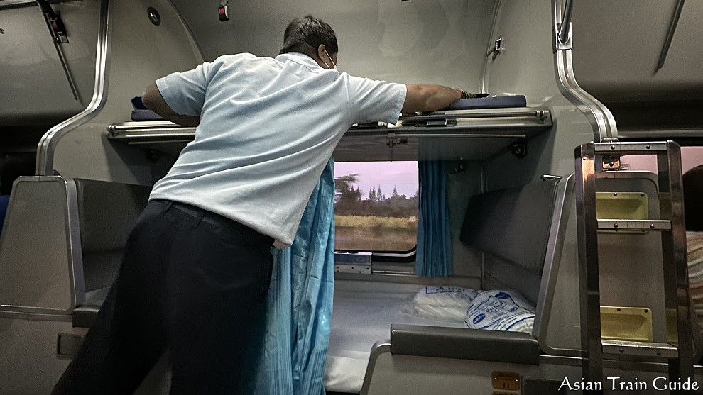The Padang Besar train uses two 2nd Class Day and Night carriages built by Daewoo in Seoul, Korea in 1996. During the day there are seats facing each other. One seat is for the person in the lower berth and the other seat for the person in the upper berth. As you can see in this photo, the seats are quite wide even though it is meant for one person. This also means the lower berth once made up is also wide. Certainly wider than the newer CNR carriages.